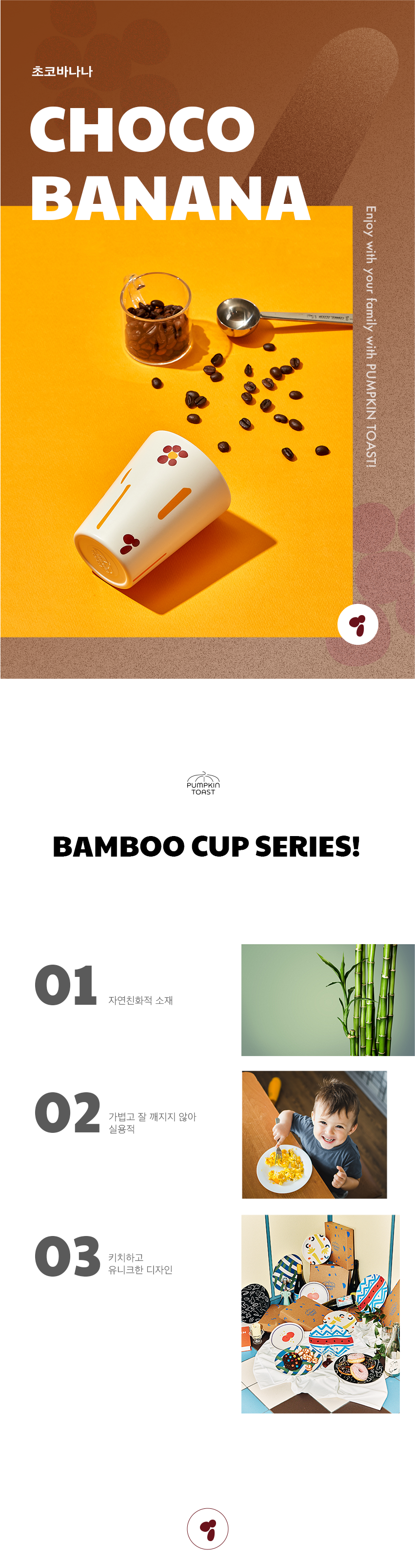 펌킨토스트의 뱀부 컵입니다. 초코와 바나나 컬러가 사랑스럽고 따뜻한 디자인입니다.